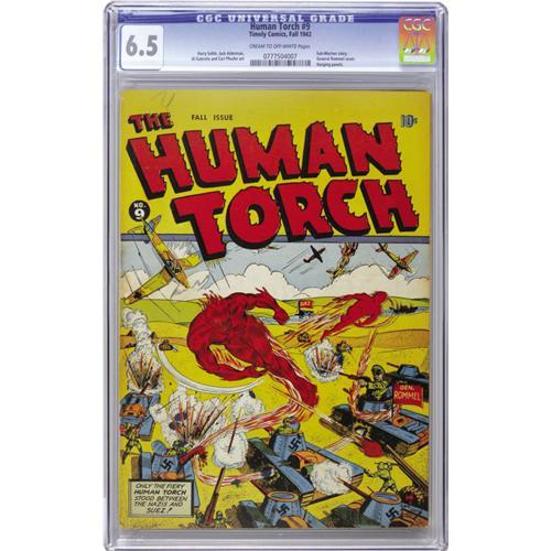 <B>The Human Torch #9 (Timely, 1942) CGC FN+ 6.5 Cream to off-white pages.</B></I> On this WWII Nazi cover, the Human Torch and Toro try to keep the Suez Canal free of General Rommel's troops. Inside is a Sub-Mariner story, hanging panels, and other Timely stuff. Overstreet 2006 FN 6.0 value = $756; VF 8.0 value = $1,575. CGC census 10/06: 2 in 6.5, 6 higher.<BR><BR><b>Shipping:</b> Slabbed Comic (<a target="_blank" href="http://www.heritageauctions.com/common/shipping.php">view shipping information</a>)