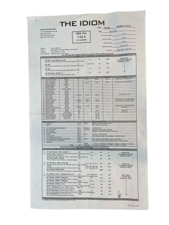 Original call sheet used on the production of the Francis Lawrence directed dystopian science fiction adventure film 'The Hunger Games: Catching Fire' (2013), the second installment in The Hunger Games trilogy. In the film, Katniss Everdeen (Lawrence) and Peeta Mellark (Hutcherson) become targets of the Capitol after their victory in the Games inspire uprisings in Panem.