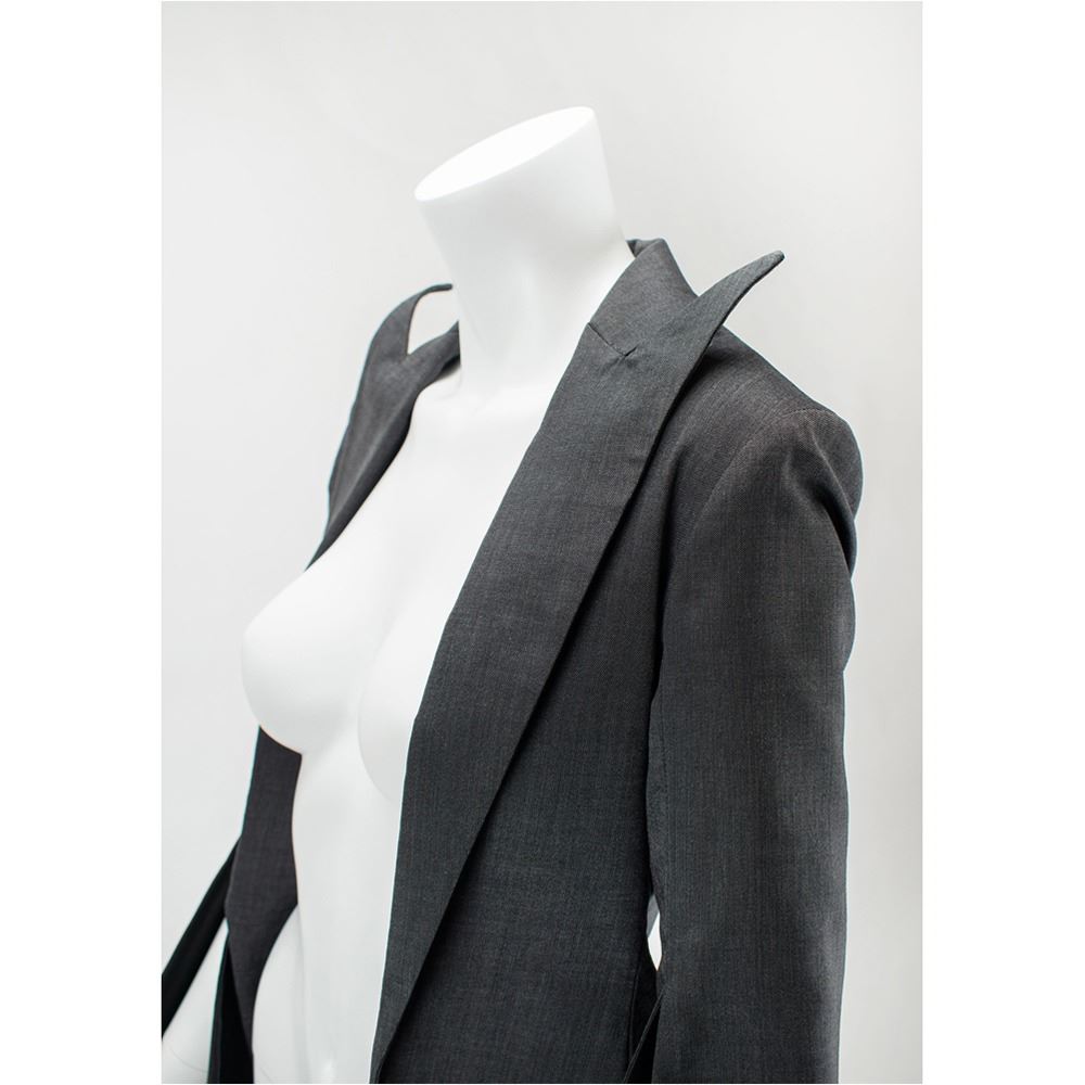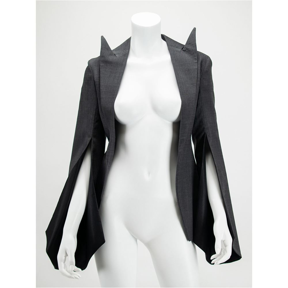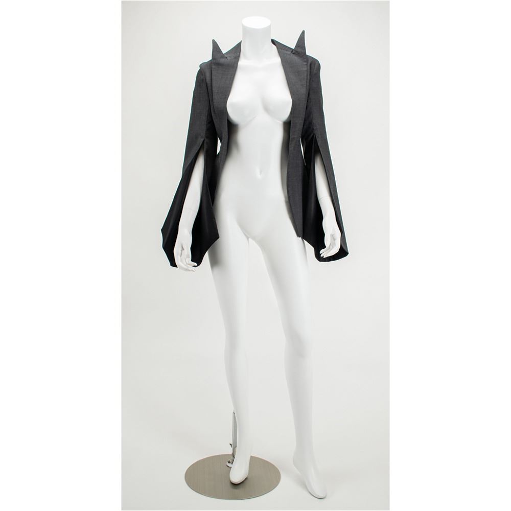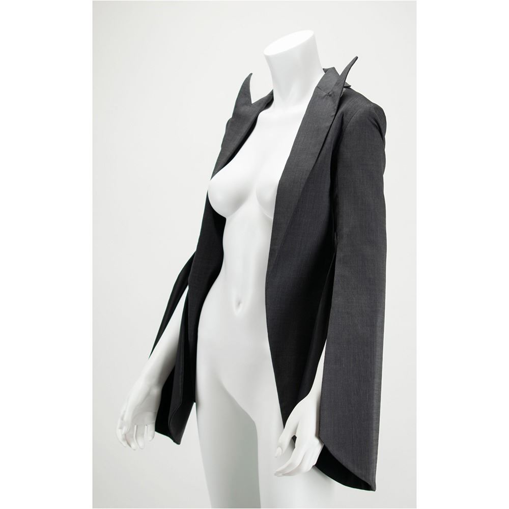 A documented jacket of gray mohair suiting fabric with black silk lining featuring signature McQueen slashed sleeves from elbow down to cuff. The collar features pointed and extended lapels and an open front cut to follow the line of the ribcage when worn. A variant of its runway counterpart, this jacket was photographed by Nick Knight and styled by Katy England along with the Grey Mohair Bumster trousers for the Spring 2015 issue of Another magazine in tribute to Lee Alexander McQueen prior to the opening of "Alexander McQueen: Savage Beauty" at the Victoria and Albert Museum in London. This jacket comes with its original pattern.
