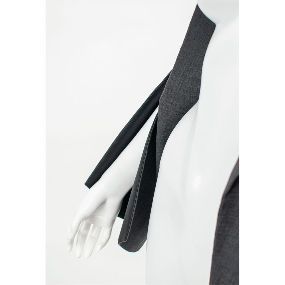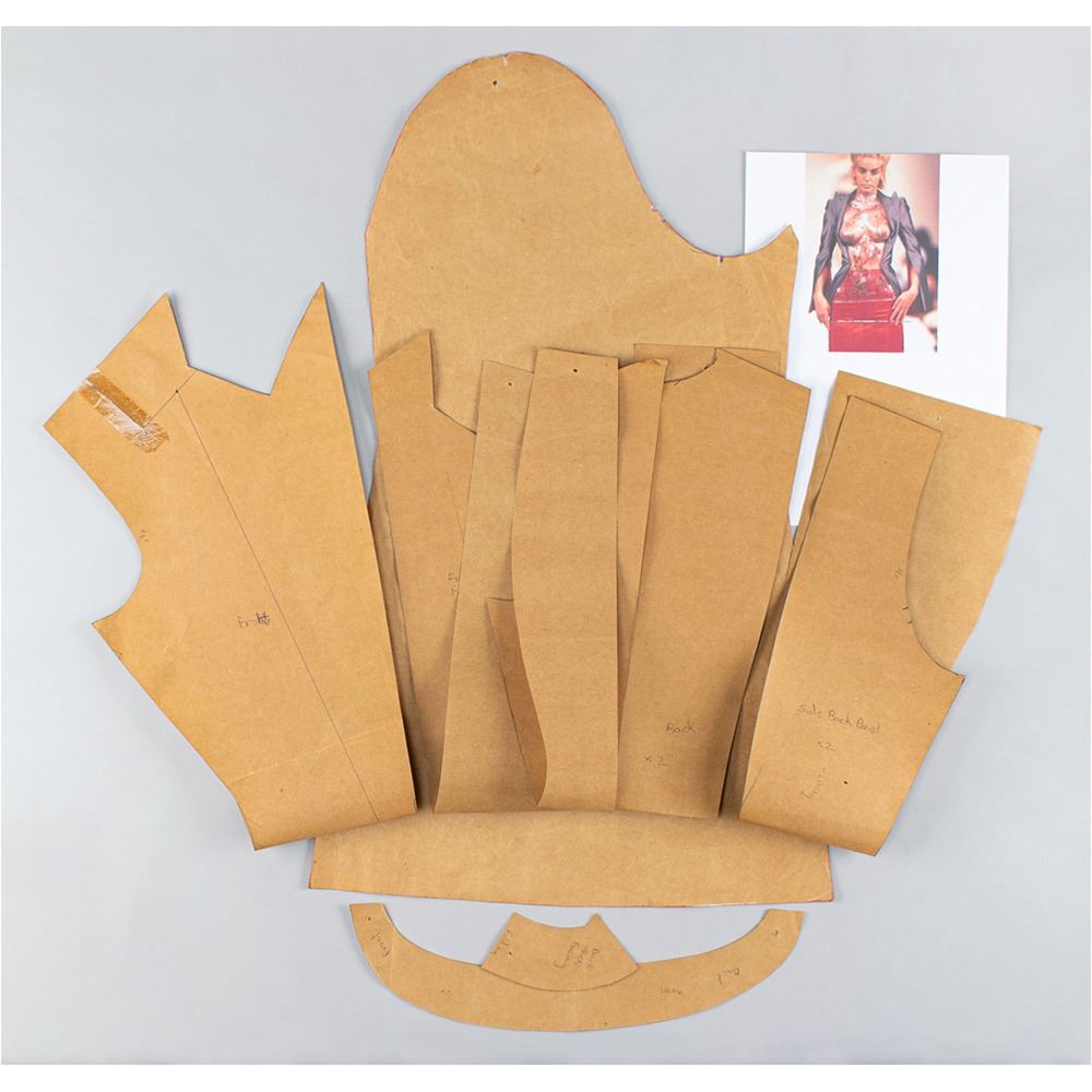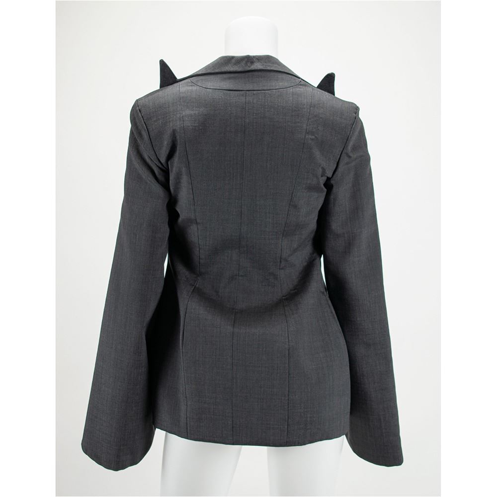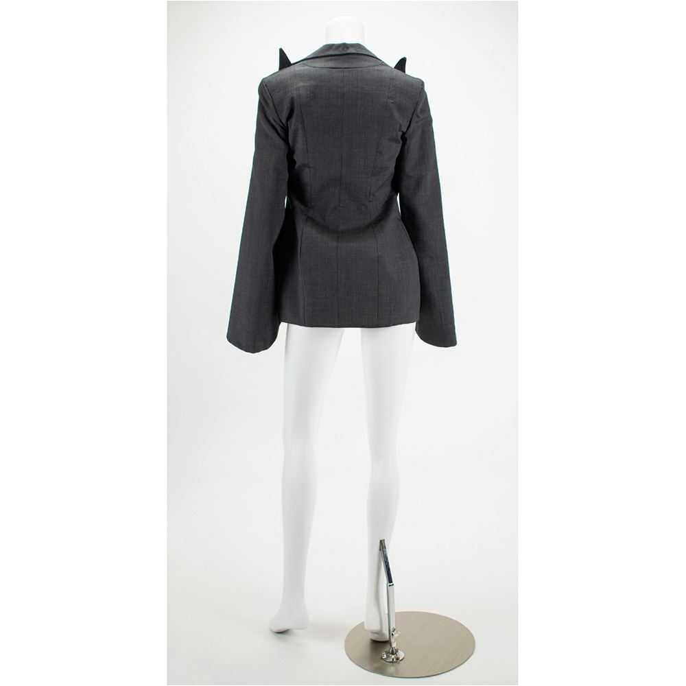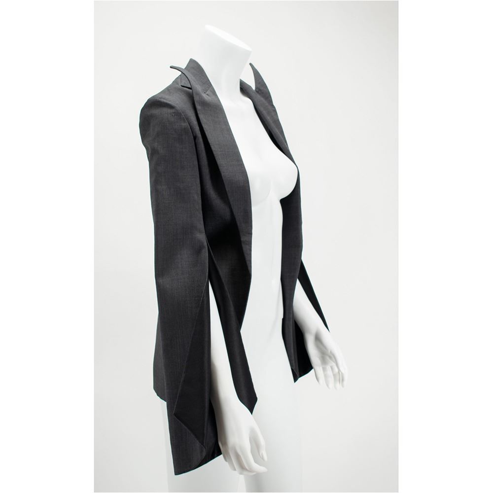 A documented jacket of gray mohair suiting fabric with black silk lining featuring signature McQueen slashed sleeves from elbow down to cuff. The collar features pointed and extended lapels and an open front cut to follow the line of the ribcage when worn. A variant of its runway counterpart, this jacket was photographed by Nick Knight and styled by Katy England along with the Grey Mohair Bumster trousers for the Spring 2015 issue of Another magazine in tribute to Lee Alexander McQueen prior to the opening of "Alexander McQueen: Savage Beauty" at the Victoria and Albert Museum in London. This jacket comes with its original pattern.