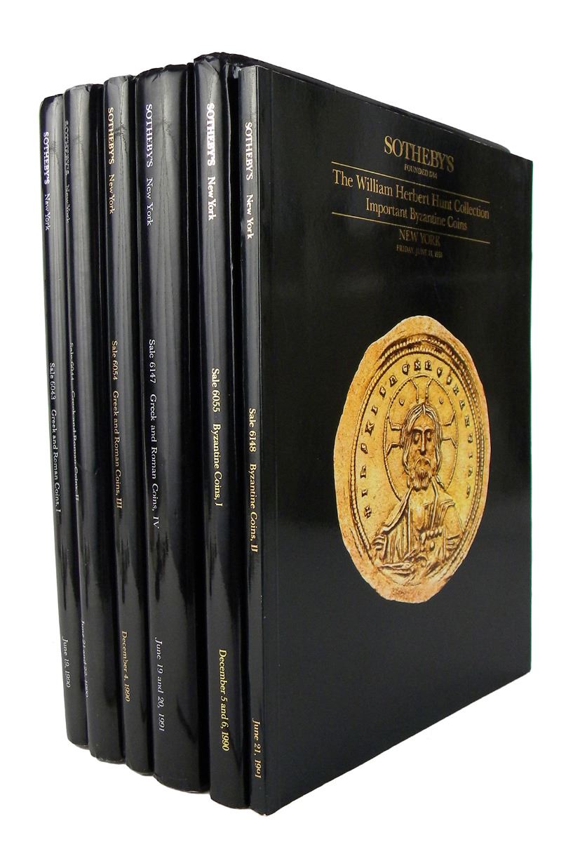 Sotheby’s. THE NELSON BUNKER HUNT COLLECTION: HIGHLY IMPORTANT GREEK AND ROMAN COINS: I-IV. New York, June 19, 1990; June 21-22, 1990; December 4, 1990; and June 19-20, 1991. Four volumes. Part I: (272) pages, 55-164 lots, all coins illustrated in monochrome at actual size, with color enlargements of both sides. Part II: (328) pages, lots 165-953, all coins illustrated in monochrome at actual size, with a number of full-page color illustrations. Part III: (256) pages, 117 lots, all coins illustrated in monochrome at actual size, accompanied by full-page color enlargements. Part IV: (400) pages, 1066 lots, most coins illustrated in monochrome at actual size, with a number of full-page color illustrations. 4to, original matching gray boards; jackets. [with] Sotheby’s. THE WILLIAM HERBERT HUNT COLLECTION: HIGHLY IMPORTANT BYZANTINE COINS: I-II. New York, Dec. 5-6, 1990 and June 21, 1991. Part I: (350) pages, 962 lots, all coins illustrated in monochrome at actual size. Part II: (144) pages, 646 lots, all coins illustrated in monochrome at actual size. 4to, first in original gray boards, jacket; second as issued in pictorial card covers. Six volumes total. Some wrinkling to fourth sale. Generally fine or nearly so. The complete series of sales of the Hunt brothers’ Greek, Roman and Byzantine coin collections. The Hunt brothers began assembling their collections in the late 1970s, frequently buying large quantities of remarkable coins at aggressive prices. Tom Eden catalogued the Greek coins, with David Tripp cataloguing the Roman material; Simon Bendall was consulted on the Byzantine coins. The sale catalogues are expertly written and beautifully illustrated.