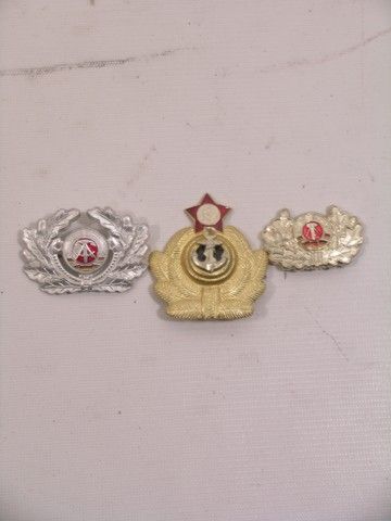 Three medals used in the background of the 1990 Sean Connery film, 'The Hunt for Red October'. One medal has laurels, with a red symbol in the middle. Another has golden laurels, with a silver anchor in the center, and a red star with a Soviet symbol inside of it. The last medal has silver laurels, with a symbol in the center. This last medal has some light wear from being used on set. (First medal measures approx. 1.75" x 1" x >0.25". Golden medal measures approx. 2.5" x 2.25" x 0.5". Silver medal measures approx. 2.25" x 1.5" x >0.25".)