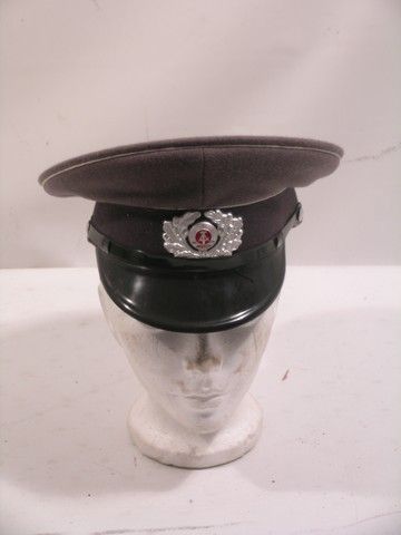 Soviet officer hat used by a background actor in 'The Hunt for Red October' (1990), starring Sean Connery as a Soviet sub captain who pilots his ship with the intention of attacking New York. This is a dark grey hat with a plastic visor, and a Soviet symbol on the front. The initials "BG" appear on the inside. (Measures approx. 10" x 10.5" x 5.5")