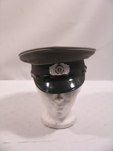 A light grey Soviet officer's hat, worn in the background of 'The Hunt for Red October' (1990). Sean Connery stars as Marko Ramius, who intends to attack New York with his submarine, and Jack Ryan, played by Alec Baldwin, tries to stop him. Hat also has a plastic visor, a Soviet symbol on the front, and the initials "BG" written on the inside. (Measures approx. 9.5" x 10.25" x 4.25")