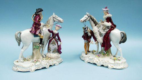 The Hunters. A decorative pair of German porcelain figural groups, depicting a young lady and a man riding a white horse, with attendants carring hunting horns. Each raised on a relief gilt and flower decorated base. 12" long, 11 1/2" high. Hallmarked for Sitzendorfer Porzellan Manufaktur.
