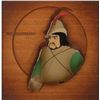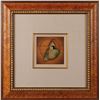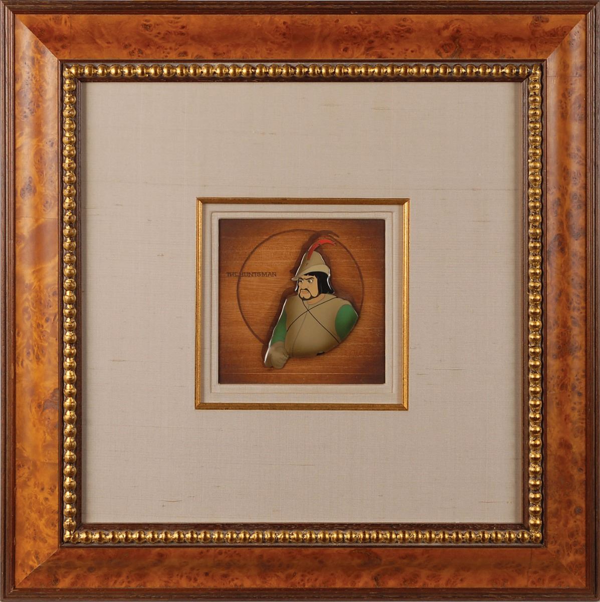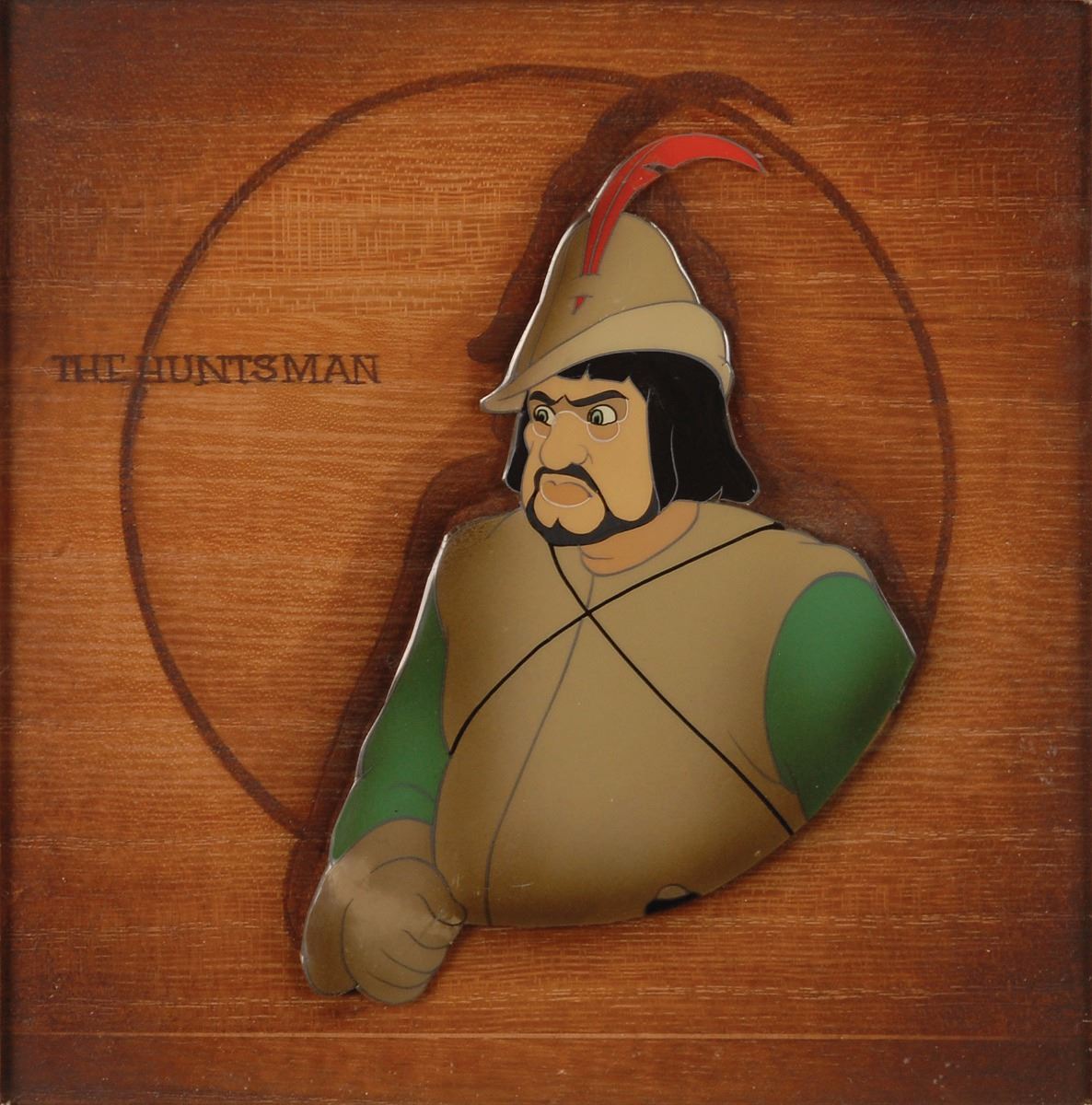 (Walt Disney Studios, 1937) Rare original production cel featuring The Huntsman from Snow White and the Seven Dwarfs. The cel has been trimmed and applied to a woodgrain background as prepared by Courvoisier Galleries for sale. Image measures 3 x 4.25, with a mat opening of 5.5 x 5.5. Framed to an overall size of 20 x 20. In fine condition. A stunning Courvoisier set-up of this very scarce character.