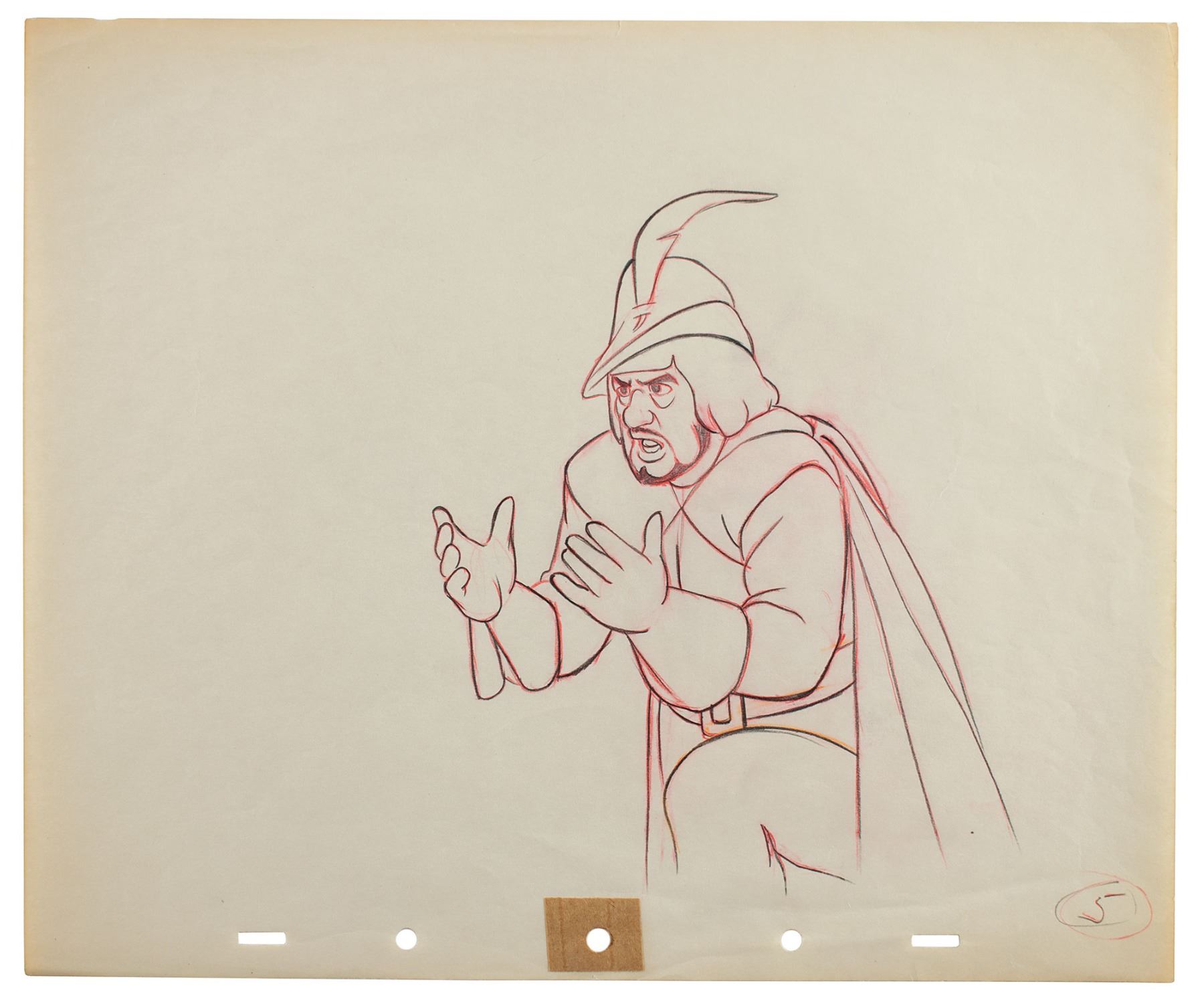 (Walt Disney Studios, 1937) Scarce original production drawing of the Huntsman from Snow White and the Seven Dwarfs, showing the hunter in a pleading half-length pose. Accomplished in graphite and colored pencil on untrimmed 12 x 10 animation paper marked "5" in the lower right corner. Image measures 6 x 7.25. In fine condition. The Huntsman remains a decidedly uncommon Disney character, as he appears only briefly in Snow White.