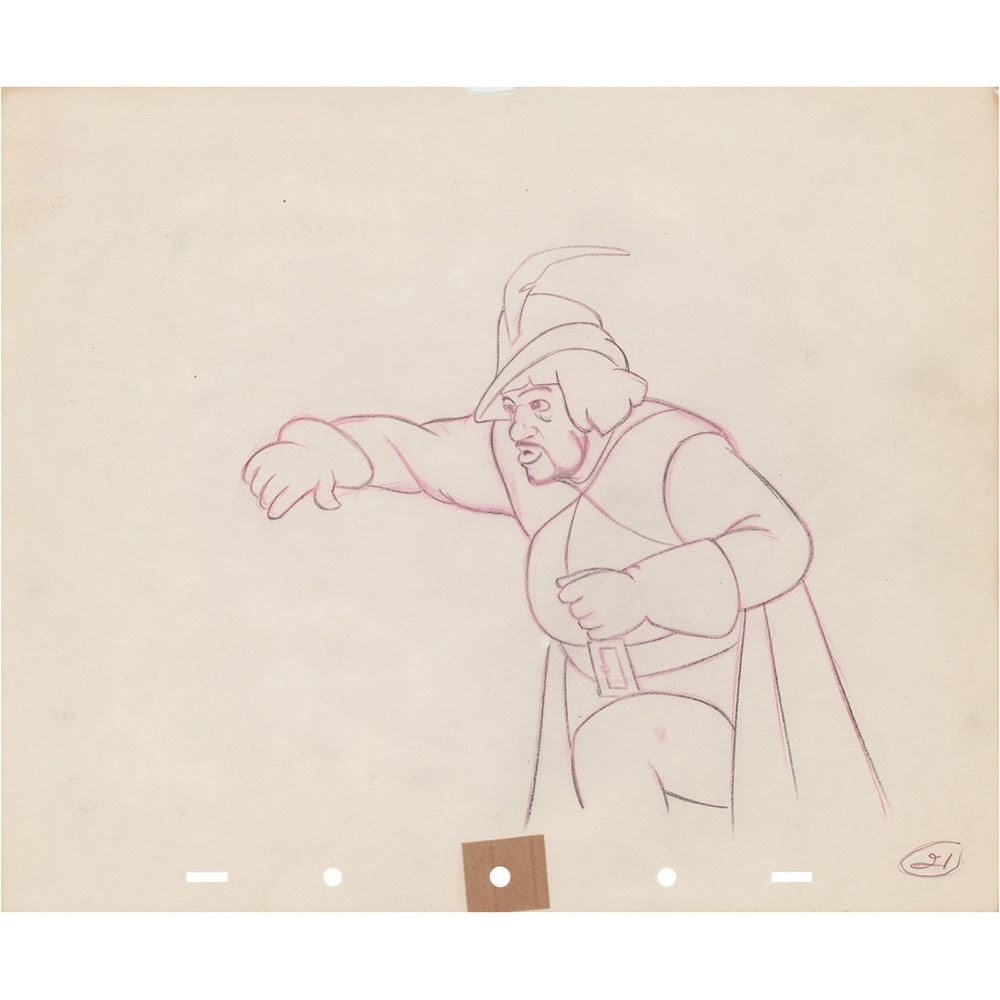 (Walt Disney Studios, 1937) Scarce original production drawing of The Huntsman from Snow White and the Seven Dwarfs, depicting the hunter in a kneeling pose measuring 8 x 7. Accomplished in graphite and colored pencil on untrimmed 12 x 10 animation paper marked "21" in the lower right corner. In fine condition, with a short chip along the top edge. The Huntsman remains a decidedly uncommon Disney character, as he appears only briefly in Snow White.
