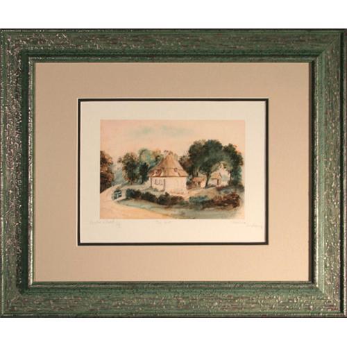 Caroline Lindsay (1820-1880) was a prolific early American artist who painted mainly landscapes of rural America and European places she traveled to. ?The Hut? is a wonderful example of the landscape paintings that she was so well-known for. This particular piece is a giclee printer?s proof of her original painting, reproduced without losing a single brushstroke or detail. In it a small cabin is shown nestled in a wooded area along a quaint dirt road or trail. The tiny windows and doors were drawn with tender care as was the charming chimney at the peak of the roof. The dense vegetation surrounding the humble dwelling allow the ?hut? to take center stage with the stark contrast from the deep greens and browns against the creamy walls of the structure. The trees were expertly articulated with layer up on layer of green in various tints and shade, giving them wonderful depth and presence. The shrubbery in the foreground was rendered with the same layering technique, giving the landscape multi-faceted tones. The sky is simple with the subtlest sweep of diluted blue to give a sense of a slightly hazy day. It is truly a breathtaking composition further enhanced by the deep charcoal bottom mat and sand speckled top mat which surround it. The deep charcoal perimeter echoes the meticulous detail around the windows and chimney and the sandy color of the top mat compliments the lightest tones from within.