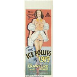 <B>The Ice Follies of 1939 (MGM, 1939)</B></I> Australian Daybill (15" X 40"). This musical drama on ice stars James Stewart and Joan Crawford as a married skating team whose on-ice partnership is short lived when Crawford receives a contract to make films in Hollywood. Stewart then teams up with his old skating partner, Lew Ayres, and they become a big success doing an ice revue in Canada. Successful but unhappily separated, the couple struggles to make their marriage work. There are fold lines, edge wear and light stains. The stone litho graphics featured on this Australian Day Bill show a wonderful full length image of Ms. Crawford. Fine+.