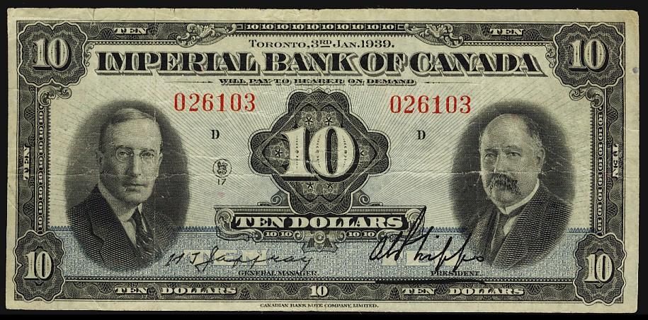 The Imperial Bank 1939 $10 #026103, CH-375-24-04. A pleasing VF note.