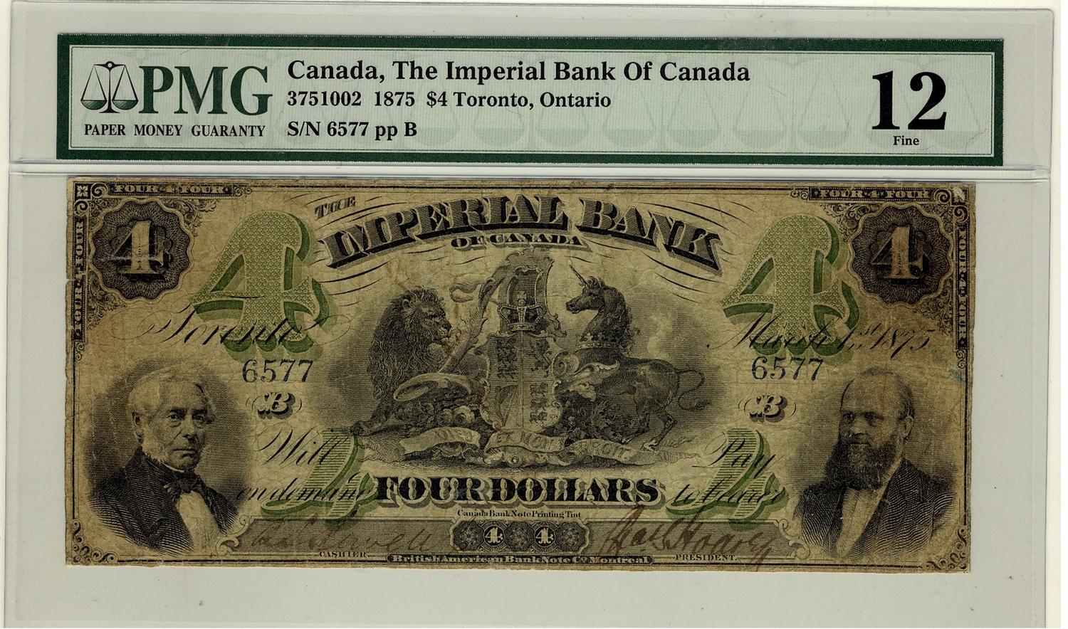 The Imperial Bank of Canada, 1875 $4 #6577, CH-375-10-02, PMG F12. Very few examples are known.