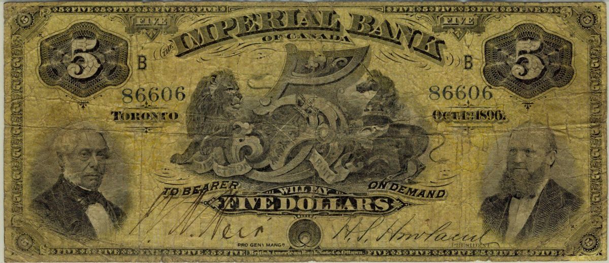The Imperial Bank of Canada 1896 $5 #86606 CH-375-10-18 PMG F12. First example ever handled by us. Extremely Rare.