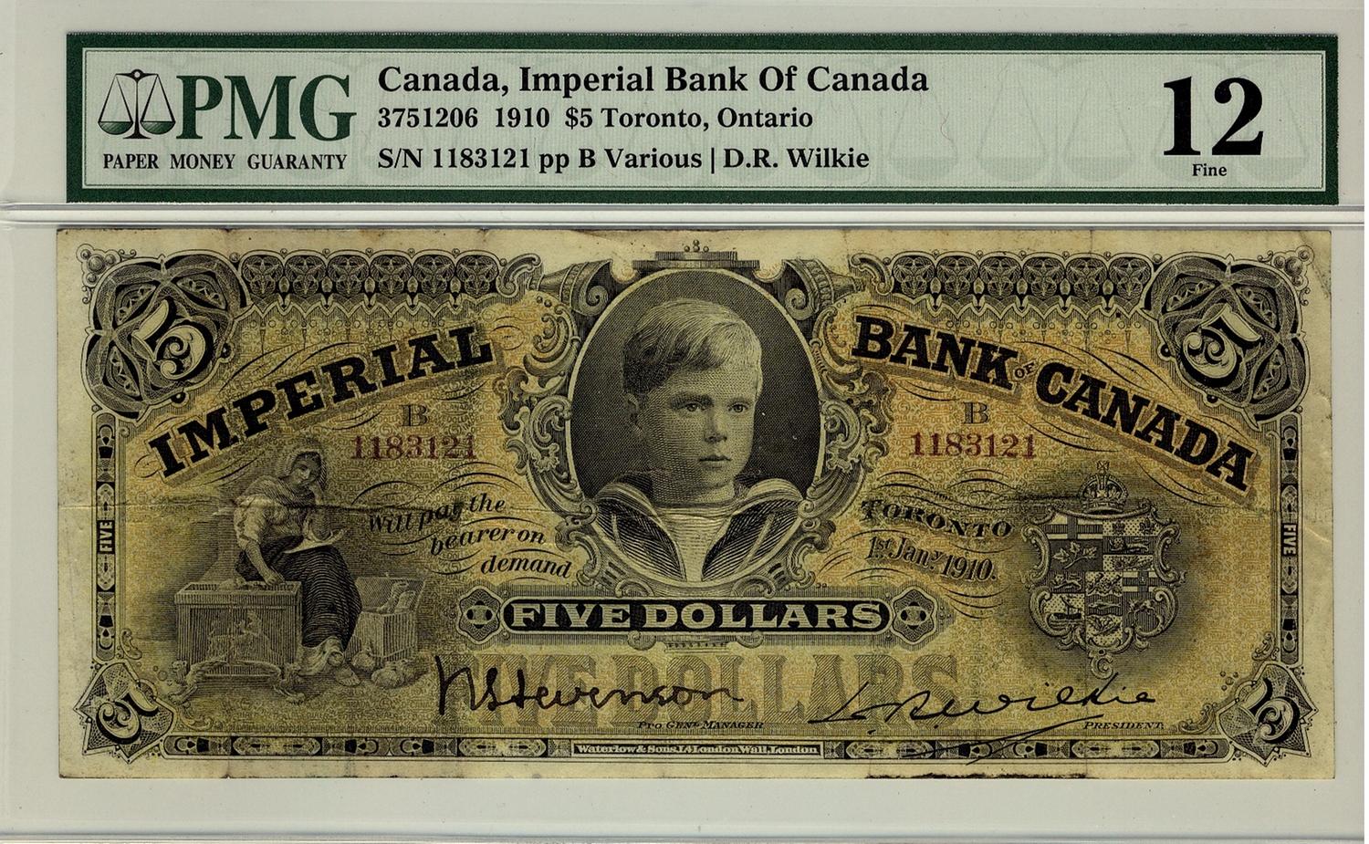 The Imperial Bank of Canada, 1910 $5 #1183121, CH-375-12-06, PMG F12. 22 examples known.