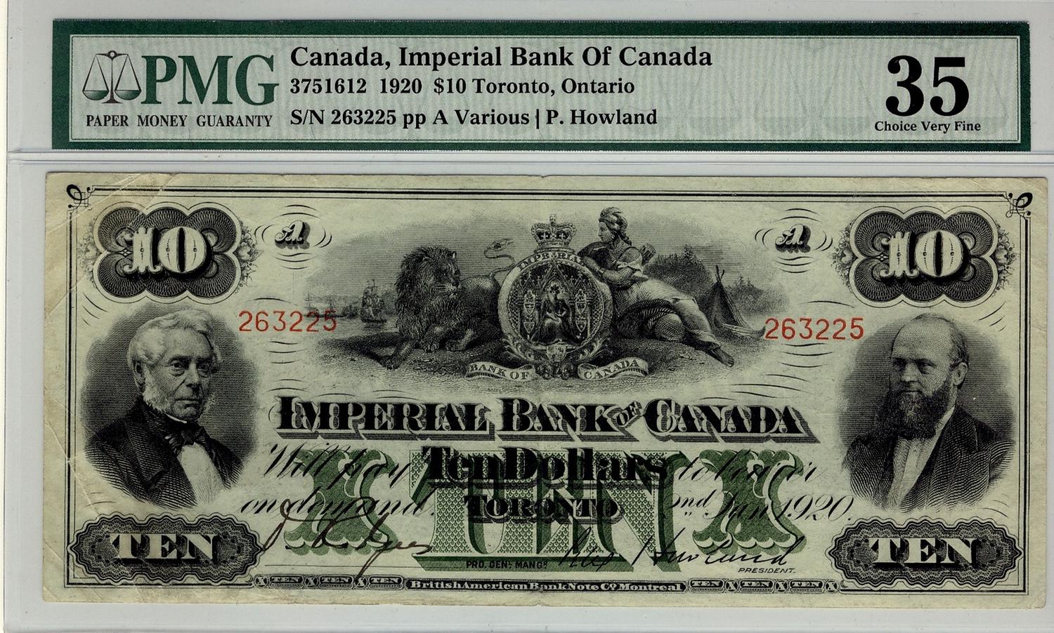 The Imperial Bank of Canada, 1920 $10 #263225, CH-375-16-12, PMG VF35, very clean and bright. The n