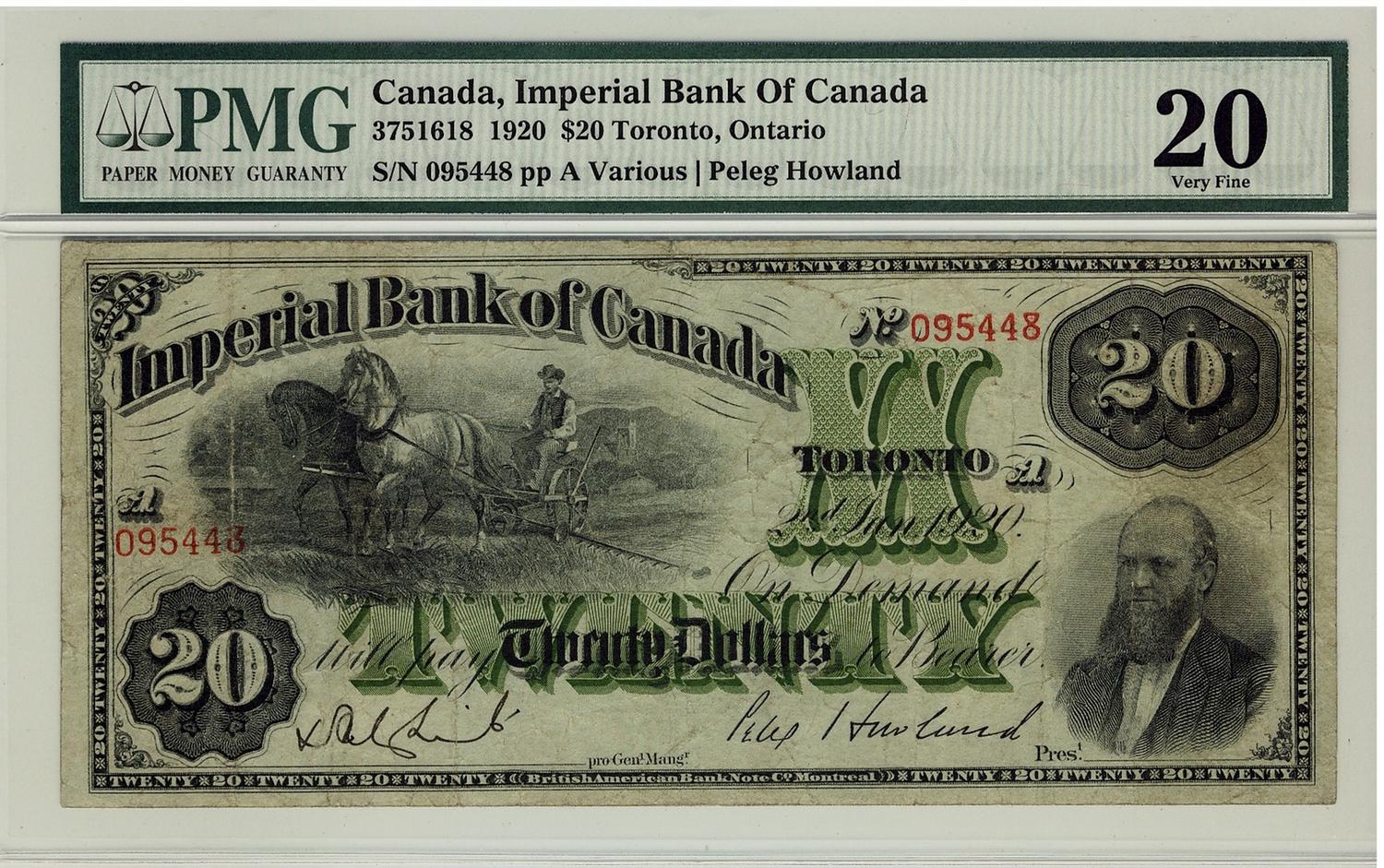 The Imperial Bank of Canada, 1920 $20 #095443, CH-375-16-18, PMG VF20. Scarce this nice.