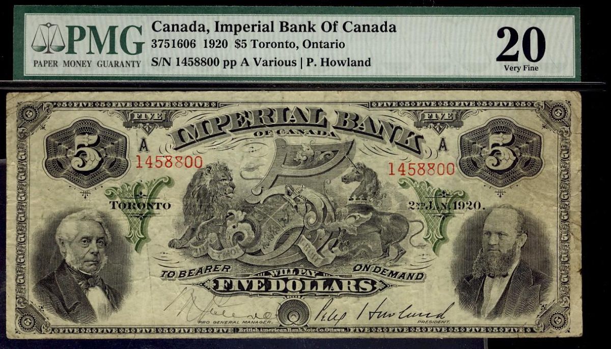 The Imperial Bank of Canada 1920 $5 #1458800 CH-375-16-06 PMG VF20.