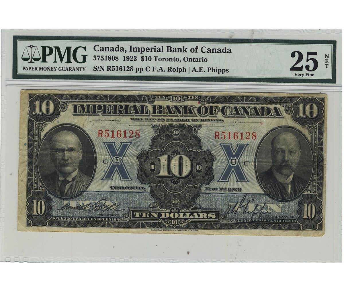 The Imperial Bank of Canada 1923 $10 CH-375-18-08. #R516128 PMG VF25 Net. Pencil and minor rust.