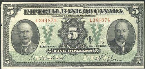 The Imperial Bank of Canada 1923 $5 L344874 "Howland" CH-375-18-02 AU. A very nice and bright note!
