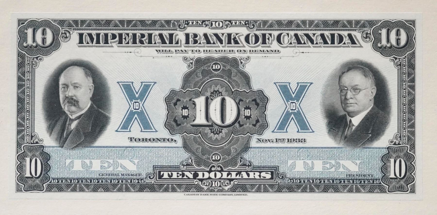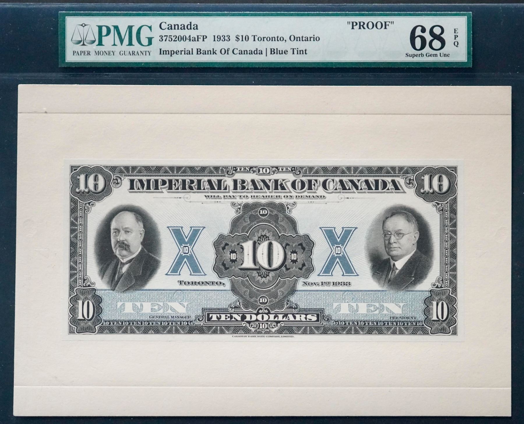 The Imperial Bank of Canada - 1933 $10 CH-375-20-04aP (Front Proof), PMG Superb Gem Uncirculated-68EPQ. Comes with Certified Vignette of Mr. Frank A. Rolph, PMG graded.