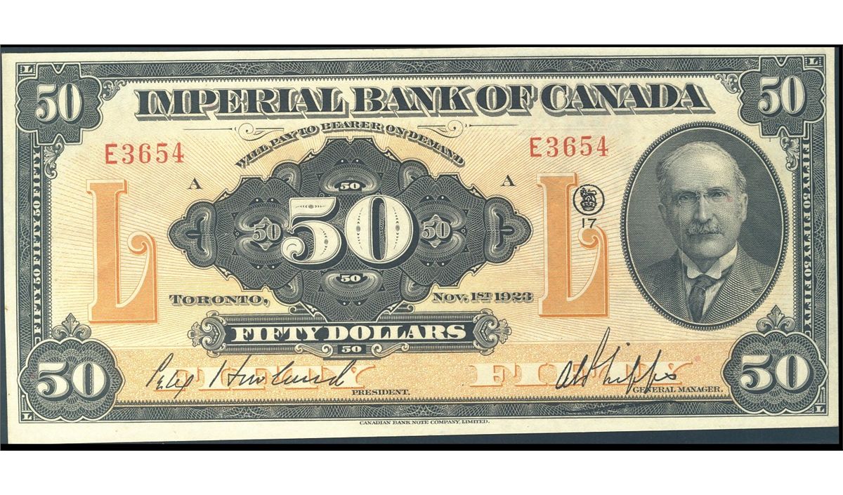The Imperial Bank of Canda; 1923 $50 #E3654 CH-375-18-14 PMG CH UNC64. Strong and clean colours. So bright and attractive. Worth a premium bid. Will be difficult to improve on this one.