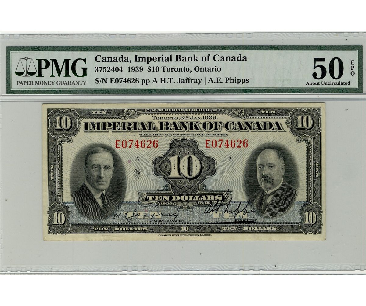 The Imperial Bank of Canda; 1939 $10 #E074626 CH-375-24-04 PMG AU50EPQ.