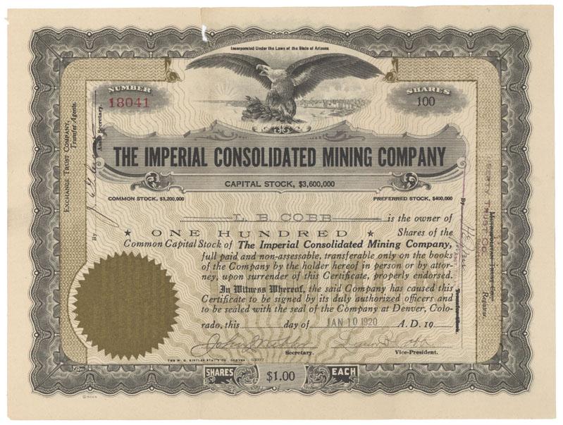 1920, Arizona. Stock certificate for 100 shares. Black/Gold. Vignette of spread eagle at top center. Small paper loss at top border along fold. Stamp cancelled and fine.