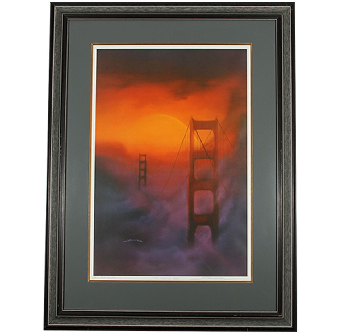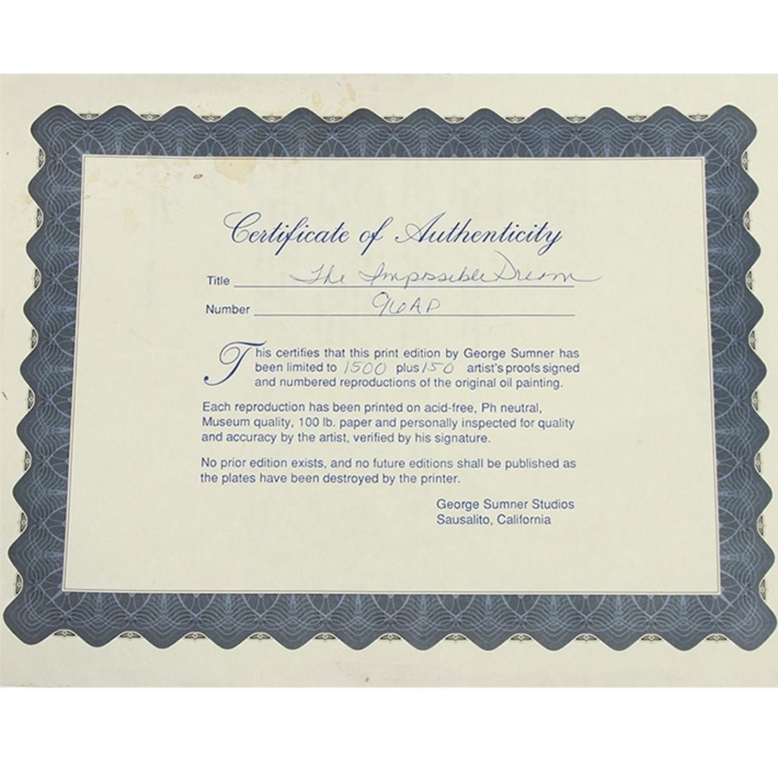 The impossible dream by George Sumner is a 22" by 32" lithograph that is signed and numbered 96 of 150. Official painting for the 50th Golden Gate Bridge celebration San Francisco, Ca. The dimensions of the frame are 30" by 39.5". Comes with certificate of authenticity by George Sumner Studio, Sausalito.