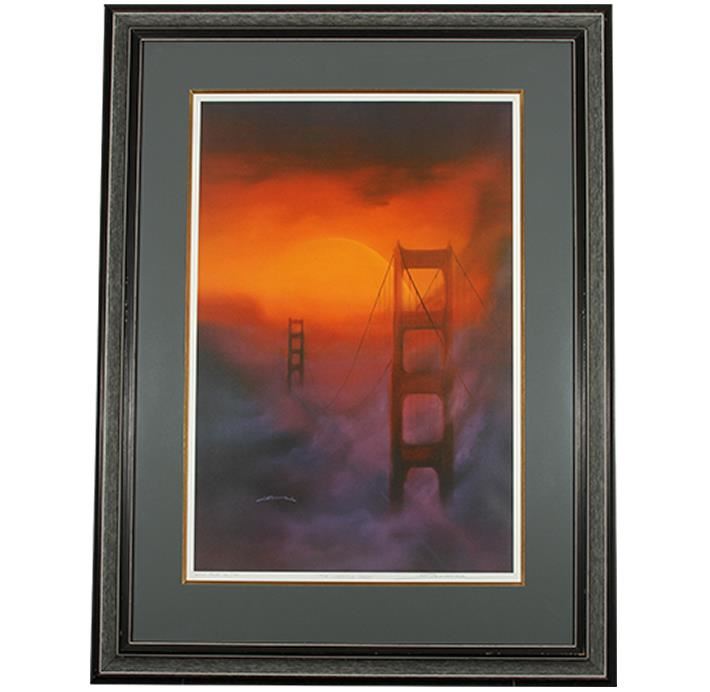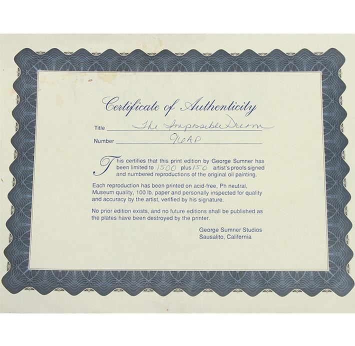 The impossible dream by George Sumner is a 22" by 32" lithograph that is signed and numbered 96 of 150. Official painting for the 50th Golden Gate Bridge celebration San Francisco, Ca. The dimensions of the frame are 30" by 39.5". Comes with certificate of authenticity by George Sumner Studio, Sausalito.