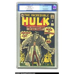 The Incredible Hulk #1 (Marvel, 1962) CGC GD+ 2.5 Off-white to white pages. This copy looks much better than the CGC-assigned grade, but CGC explains, "2 inch x 2 inch piece off corner of 15th page, affects story." Here's a good economical way to have this classic Jack Kirby cover of one of the earliest of Marvel's Silver Age superheroes. Overstreet 2002 GD 2.0 value = $600. Important notice: We expect to be auctioning lots at the rate of 200-250 per hour. Sometimes eBay Premier live bid software cannot keep up with that pace, so we strongly recommend that you place a realistic proxy bid now as insurance to avoid disappointment. Also please note that all Heritage/CAA lots purchased through eBay Premier carry a 20% Buyer's Premium. Please make sure you read the Terms and Conditions.