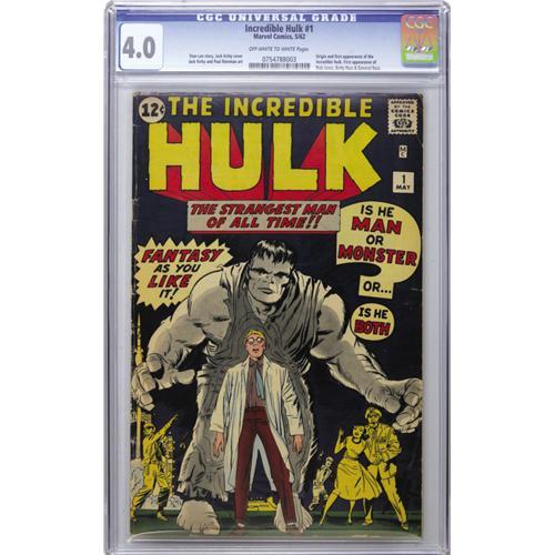 <B>The Incredible Hulk #1 (Marvel, 1962) CGC VG 4.0 Off-white to white pages.</B></I> This classic first issue from Marvel features the origin and first appearance of the Incredible Hulk. Though he would become known for his green skin starting in the very next issue, this one features a grey colored monster. Jack Kirby provided the cover and art. Overstreet 2006 VG 4.0 value = $1,450. CGC census 10/06: 24 in 4.0, 135 higher. <I>From the Madison Monk Collection.</B></I><BR><BR><b>Shipping:</b> Slabbed Comic (<a target="_blank" href="http://www.heritageauctions.com/common/shipping.php">view shipping information</a>)