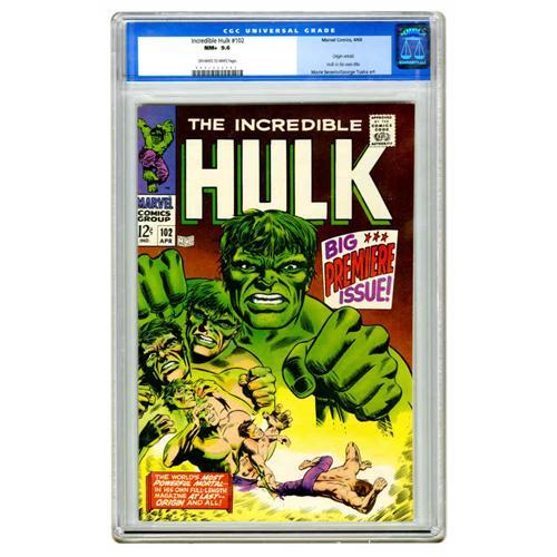 <B>The Incredible Hulk #102 (Marvel, 1968) CGC NM+ 9.6 Off-white to white pages.</B></I> You know what's <I>really</B></I> hard to find? Those <B>Hulk</B></I> issues from #7-101! Just kidding -- after canceling the original series with #6, Marvel didn't give the Hulk his own book again until five years later, and when they did so, they continued the numbering from <B>Tales to Astonish</B></I> #101. Marie Severin drew the issue's cover and teamed with George Tuska on the interior art. Overstreet 2005 NM- 9.2 value = $350. CGC census 12/05: 39 in 9.6, 5 higher.