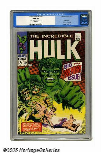 <B>The Incredible Hulk #102 (Marvel, 1968) CGC NM+ 9.6 White pages.</B></I> Bruce Banner would need one of his microscopes to find fault with this superb copy -- there are certainly none to be seen with the naked eye! This #102 is actually a "first issue," with the Hulk finally starring in his own magazine again after an all too brief six-issue stint years earlier. The interior art is courtesy of Marie Severin and George Tuska. CGC notes, "'1-1-68' written on back cover in pen." Overstreet 2005 NM- 9.2 value = $350. CGC census 7/05: 37 in 9.6, 5 higher.