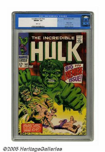 <B>The Incredible Hulk #102 (Marvel, 1968) CGC NM/MT 9.8 White pages.</B></I> The Hulk had his own book once again starting with this issue, with both the story and the numbering continued from <B>Tales to Astonish</B></I> #101 (but without Sub-Mariner taking up half the comic). Greenskin must have thought he had gotten switched to <B>Journey Into Mystery</B></I> considering the cast of guest-stars, which includes the Warriors Three, Odin, and the Enchantress. The issue has a Marie Severin cover, with interior art by Severin and George Tuska. Overstreet 2005 NM- 9.2 value = $350. CGC census 3/05: 5 in 9.8, none higher.