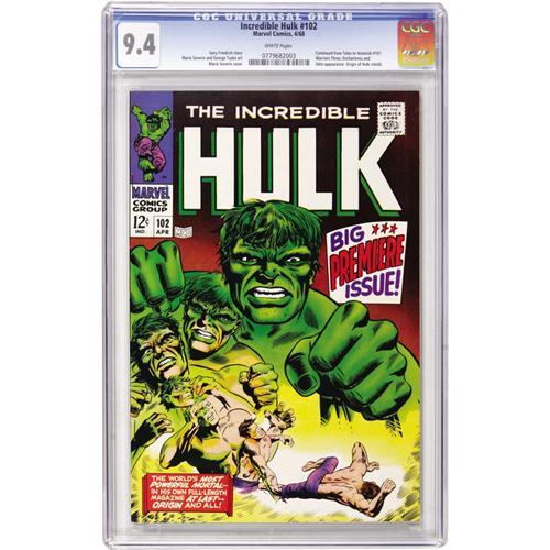 <B>The Incredible Hulk #102 (Marvel, 1968) CGC NM 9.4 White pages.</B></I> It's the first issue of this series, which continued the numbering (and the storyline) from <B>Tales to Astonish</B></I> #101. The cover is by Marie Severin. Overstreet 2006 NM- 9.2 value = $365. CGC census 3/07: 66 in 9.4, 45 higher.<BR><BR><b>Shipping:</b> Comics - Slabbed (certified) (<a target="_blank" href="http://www.heritageauctions.com/common/shipping.php">view shipping information</a>)