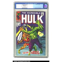 The Incredible Hulk #103 (Marvel, 1968) CGC VG/FN 5.0 Off-white pages. Hulk tangles with the Space Parasite in this issue. Featuring a clean cover and bright colors, this copy looks new, but has a subscription crease through the middle, partly visible through the case. Overstreet 2002 GD 2.0 value = $9; FN 6.0 value = $27. Important notice: We expect to be auctioning lots at the rate of 200-250 per hour. Sometimes eBay Premier live bid software cannot keep up with that pace, so we strongly recommend that you place a realistic proxy bid now as insurance to avoid disappointment. Also please note that all Heritage/CAA lots purchased through eBay Premier carry a 20% Buyer's Premium. Please make sure you read the Terms and Conditions.