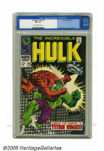 <B>The Incredible Hulk #106 (Marvel, 1968) CGC NM- 9.2 Cream to off-white pages.</B></I> Nick Fury appears. Marie Severin cover and layouts. Herb Trimpe and George Tuska art. Overstreet 2005 NM- 9.2 value = $95. CGC census 1/05: 14 in 9.2, 17 higher.