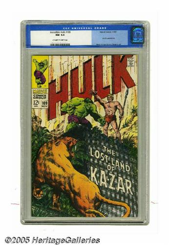 <B>The Incredible Hulk #109 (Marvel, 1968) CGC NM 9.4 Off-white to white pages.</B></I> The Hulk goes to the Savage Land and meets Ka-Zar and his loyal sabre-tooth tiger, Zabu. It's a fairly minor point of interest, but we can't resist mentioning that Ka-Zar is one of Marvel's oldest characters, dating back to a story in <B>Marvel Comics</B></I> #1, and even further back in time, with a scarce pulp series, appropriately titled <B>Ka-Zar</B></I>, which was published by Martin Goodman's Red Circle Magazines. Herb Trimpe and John Severin did the cover and interior art for this issue. Overstreet 2005 NM- 9.2 value = $75. CGC census 1/05: 20 in 9.4, 6 higher.
