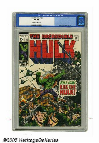 <B>The Incredible Hulk #120 (Marvel, 1969) CGC NM 9.4 Off-white to white pages.</B></I> The Hulk vs. the U.S. Army. Maximus appearance. Herb Trimpe cover and art. Overstreet 2005 NM- 9.2 value = $45. CGC census 1/05: 5 in 9.4, 2 higher.