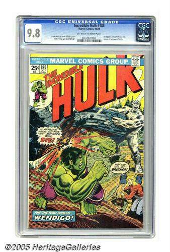<B>The Incredible Hulk #180 (Marvel, 1974) CGC NM/MT 9.8 Off-white to white pages.</B></I> If you want the very first appearance of Wolverine, this is the issue you need to grab, as his last-page cameo here was Wolvie's debut. The rest of the issue is a rollicking yarn in itself, a north-of-the-border dust-up between the Hulk and Wendigo. The cover and art are by Herb Trimpe. It's a mystery to us why this book guides at only a tenth the price of the following issue; expect that to change. CGC hasn't certified a better copy of this issue to date. Overstreet 2005 NM- 9.2 value = $250. CGC census 6/05: 5 in 9.8, none higher.