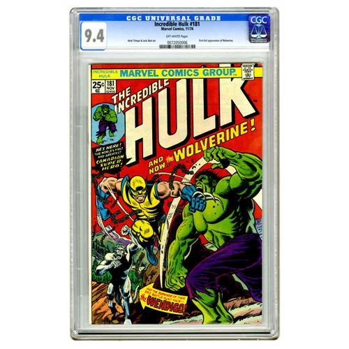 <B>The Incredible Hulk #181 (Marvel, 1974) CGC NM 9.4 Off-white pages.</B></I> Some collectors didn't pluck this issue off the newsstands when it came out, others read their copies so many times that they're well-worn, and others still cut out the Shanna the She-Devil Marvel Value Stamp -- sorry if any of those apply to you! But here's your chance to make up for any of those missteps by acquiring a sharp NM copy of this key issue, the first full appearance of Wolverine and the most valuable Bronze Age comic book. Overstreet 2005 NM- 9.2 value = $1,300. CGC census 12/05: 169 in 9.4, 110 higher.