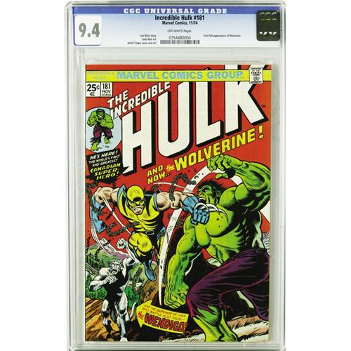 <B>The Incredible Hulk #181 (Marvel, 1974) CGC NM 9.4 Off-white pages.</B></I> Any Bronze Age buff would love this NM copy of the first full appearance of Wolverine! The Wendigo's on hand too for a three-way punch-up. The cover and interior art are by <I>the</B></I> Hulk artist of the Bronze Age, Herb Trimpe. Overstreet 2006 NM- 9.2 value = $1,350. CGC census 3/06: 172 in 9.4, 113 higher.