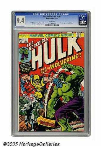 <B>The Incredible Hulk #181 (Marvel, 1974) CGC NM 9.4 White pages.</B></I> The ultimate book of the 1970s features the first full appearance of Wolverine. Thanks to the massive success of the X-Men throughout the '80s and '90s, collectors have sought out Wolvie's introduction, pushing this book into the stratosphere of super-keys. This copy has extremely nice page quality. Herb Trimpe and Jack Abel art. Overstreet 2005 NM- 9.2 value = $1,300. CGC census 1/05: 154 in 9.4, 94 higher.