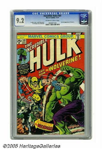 <B>The Incredible Hulk #181 (Marvel, 1974) CGC NM- 9.2 Off-white to white pages.</B></I> A NM- 9.2 copy of this issue, the first full appearance of Wolverine, would be the jewel of many a comic collection. The honor of drawing Wolvie's first story went to Hulk artist extraordinaire Herb Trimpe. Overstreet 2005 NM- 9.2 value = $1,300. CGC census 5/05: 208 in 9.2, 261 higher.