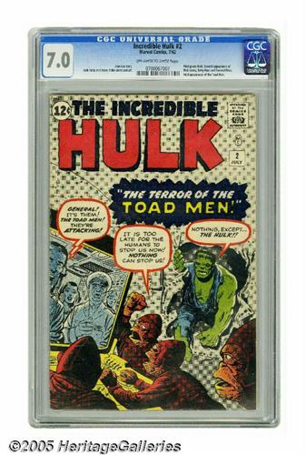 <B>The Incredible Hulk #2 (Marvel, 1962) CGC FN/VF 7.0 Off-white to white pages.</B></I> The Hulk turns green for the first time in this second issue of his solo title. In a rare artistic team-up, Jack Kirby's pencils were inked by Spider-Man artist Steve Ditko. This is a nice mid-high-grade copy that shows wear appropriate to the grade, but nice color and clarity. Overstreet 2005 FN 6.0 value = $687; VF 8.0 value = $2,004. CGC census 1/05: 8 in 7.0, 26 higher.