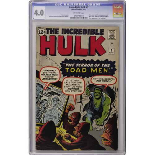 <B>The Incredible Hulk #2 (Marvel, 1962) CGC VG 4.0 Off-white pages.</B></I> This issue has the first appearance of the green Hulk and the second appearances of Rick Jones, Betty Ross, and General Ross. The Toad Men make their entry into comicdom with this issue as well. The cover and interior art are furnished by Jack Kirby and Steve Ditko. Overstreet 2006 VG 4.0 value = $472. CGC census 9/06: 12 in 4.0, 107 higher. <I>From the Madison Monk Collection.</B></I><BR><BR><b>Shipping:</b> Slabbed Comic (<a target="_blank" href="http://www.heritageauctions.com/common/shipping.php">view shipping information</a>)