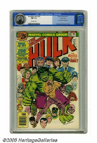 <B>The Incredible Hulk #200 Pacific Coast pedigree (Marvel, 1976) CGC NM 9.4 Off-white pages.</B></I> Rich Buckler cover, inked by John Romita Sr. Sal Buscema art. Overstreet 2005 NM- 9.2 value = $32. CGC census 6/05: 45 in 9.4, 58 higher.