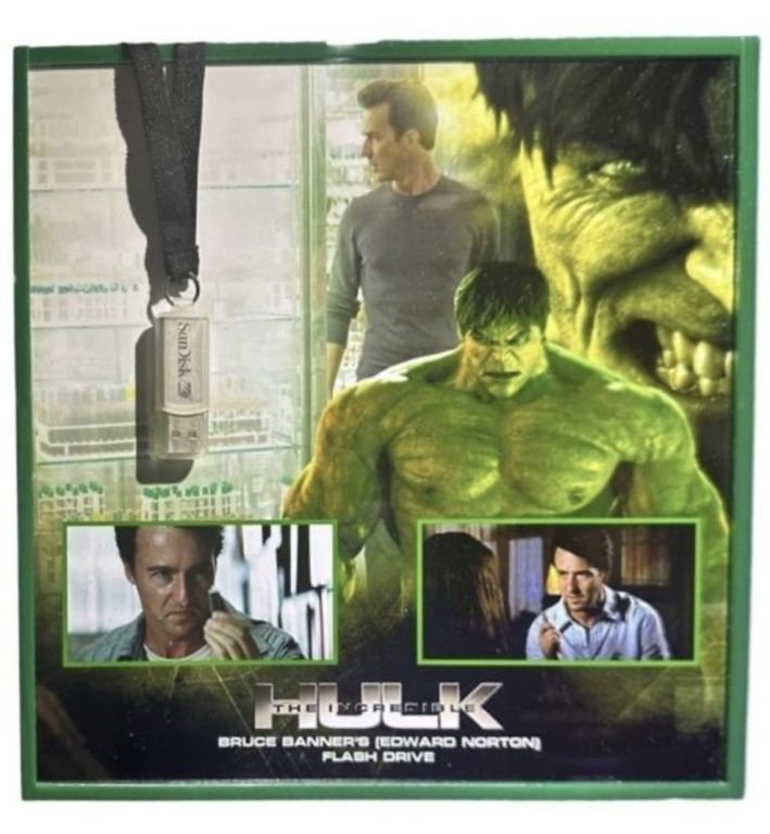 Original flash drive used by "Bruce Banner", played by Edward Norton in the Louis Leterrier directed superhero film 'The Incredible Hulk' (2008), where Bruce Banner becomes the Hulk as an unwitting pawn in a military scheme to reinvigorate the "Super-Soldier" program through gamma radiation. Banner goes on the run from the military while attempting to cure himself of the Hulk.