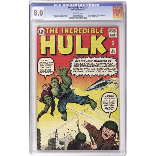 <B>The Incredible Hulk #3 (Marvel, 1962) CGC VF 8.0 Off-white pages.</B></I> Jack Kirby got back to his Timely roots here, drawing the first Silver Age appearance of the Ringmaster, last seen in <B>Captain America Comics</B></I> of yore. Overstreet 2006 VF 8.0 value = $1,275. CGC census 3/07: 9 in 8.0, 14 higher.<BR><BR><b>Shipping:</b> Comics - Slabbed (certified) (<a target="_blank" href="http://www.heritageauctions.com/common/shipping.php">view shipping information</a>)
