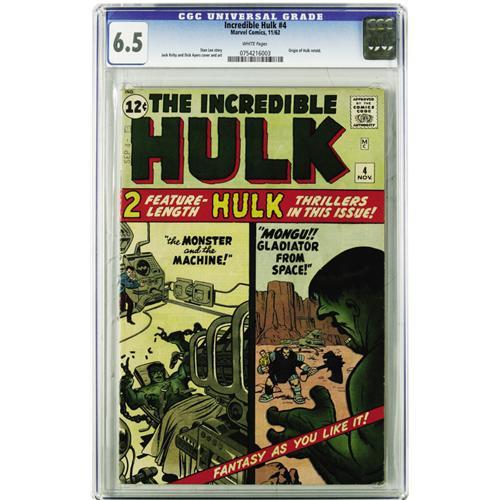 <B>The Incredible Hulk #4 (Marvel, 1962) CGC FN+ 6.5 White pages.</B></I> A brief retelling of the Hulk's origin is the highlight of this fourth issue, which also includes a confrontation with "Mongu! Gladiator from Space!," and an appearance by Rick Jones. Jack Kirby provided the cover and story art -- but you knew that already, right, True Believers? Of course! A sweet copy to be sure, with oh-so-white pages. Overstreet 2006 FN 6.0 value = $420; VF 8.0 value = $1,190. CGC census 3/06: 13 in 6.5, 71 higher.